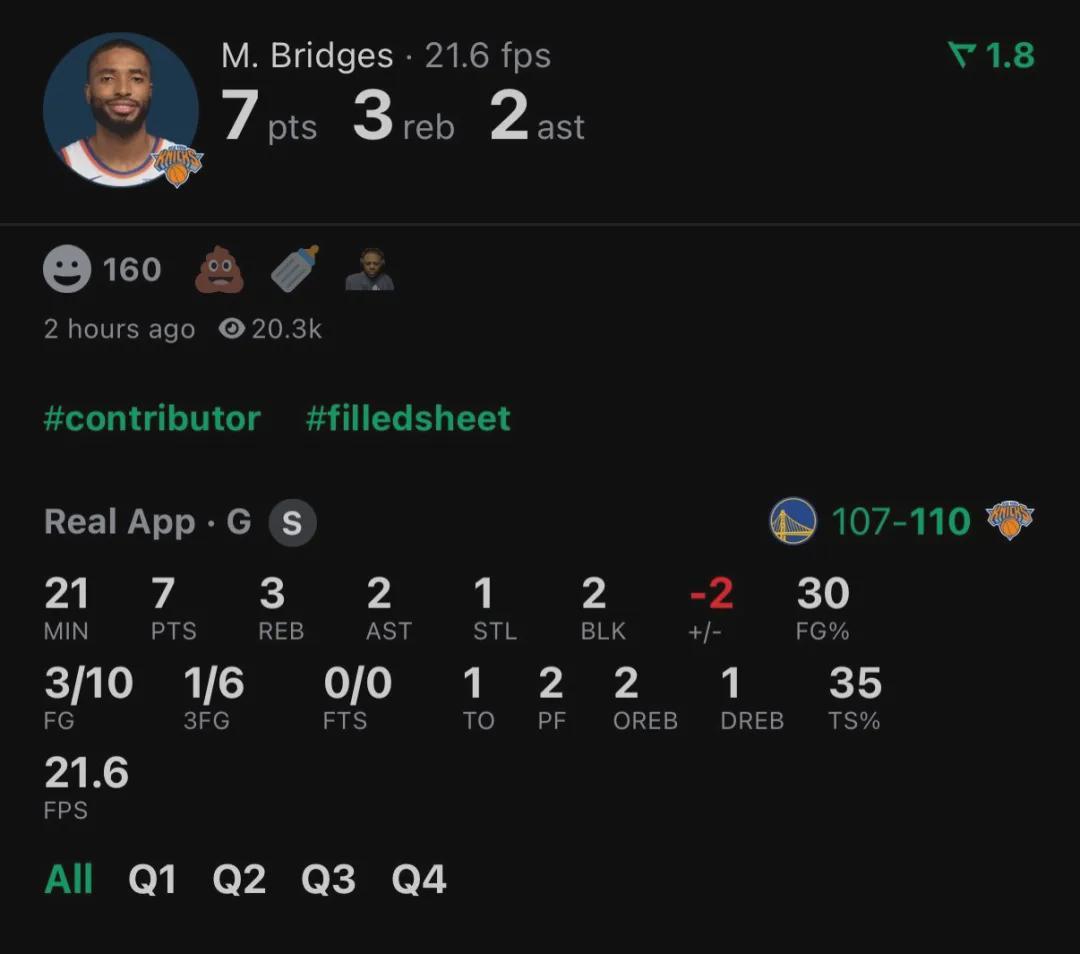 北京时间3月16日,NBA常规赛,尼克斯主场110-107险胜勇士。尼克斯球员米卡尔-布里奇斯首发出战21分钟,投篮10中3,三分6中1,得到7分3篮板2助攻1抢断2盖帽1失误2犯规,正负值-2。最近3场比赛,大桥三分合计15中3。